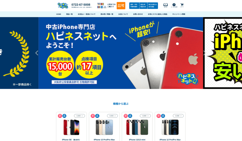 『ハピネスネット』は、中古iPhoneに特化した專門オンラインショップです。Androidもごくわずかですが取り扱っています。業界最安値に挑戦!を掲げているだけあり価格帯も安いので、中古のiPhoneに狙いを絞っている場合は必ずチェックしておきたいお店です!