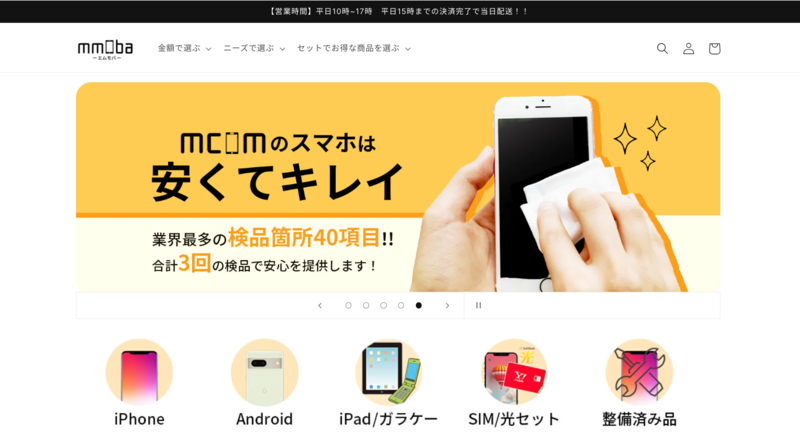 おすすめの中古スマホショップ第4位は、「安心できる中古スマホ販売店【mmoba】 」です。中古iphone/Androidをはじめ、タブレット、ガラケー、整備品を取り扱っています。