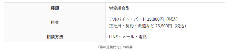 労働組合型のサービスなので、有給休暇など会社との交渉も代行してくれるというのも大きな特徴となっています。男性に特化していることから職場環境を熟知しており、トラブル回避にも長けているという点がメリットです。