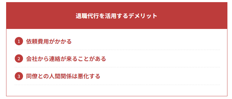 会社から連絡が来ることがあるというのもデメリットとして挙げられます。基本的に、退職代行を活用する場合は職場や同僚・上司とコミュニケーションをする必要は一切ありません。