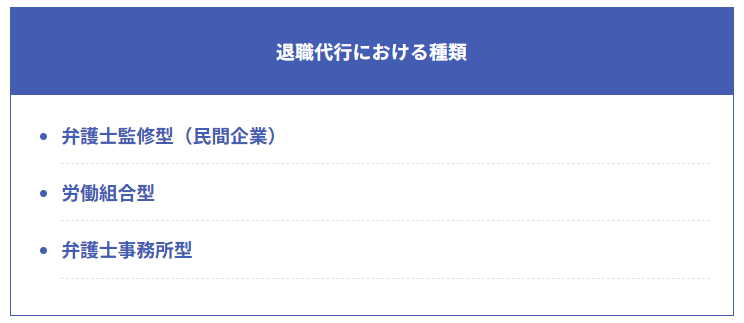 退職代行は選び方がとても重要です。そもそも、一口に退職代行と言っても退職代行には大きく分けて下記の3種類があり、それぞれ特徴が大きく異なるという点を把握しておく必要があります。