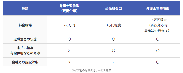 弁護士監修型は退職意思の伝達・事務対応のみが可能です。労働組合型の場合はそれに加えて未払い給与・有給休暇などの交渉が可能となります。弁護士事務所型はそれに加えて訴訟対応まで可能となっています。