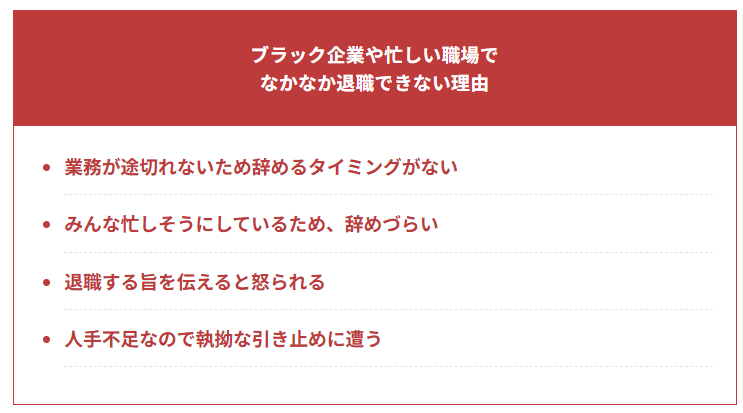 退職代行を活用するメリットとして、ブラック企業や忙しい職場でも退職できるという点も挙げられます。ブラック企業や忙しい職場では、次々に新しい仕事を振られてしまうことでなかなか一区切りがつかず辞めるタイミングを逃してしまったり、退職の意思を伝えるとハラスメントを受けてますます辞められなくなるというケースもあります。