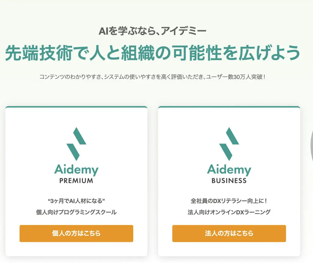 | Aidemy | – 30万人以上が利用するオンラインAI学習サービス – 図解やイラストを多用して分かりやすい教材 – 未経験でもAIの基礎から実践スキルまでを習得可能 |