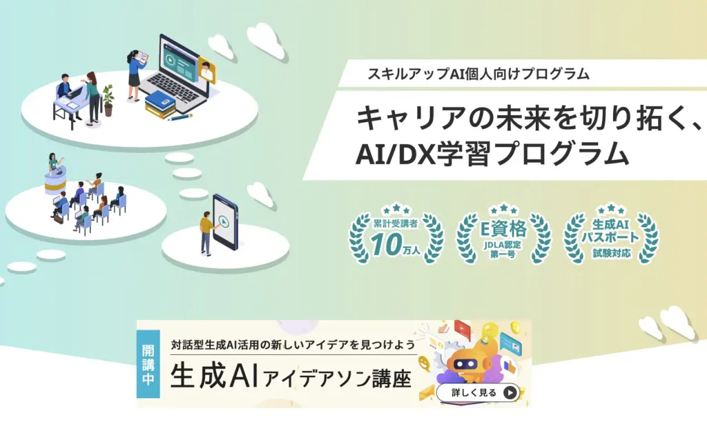 | スキルアップAI | – AI特化のスクールで、実務で役立つカリキュラムとサポートが特徴 – オンライン完結型でいつでも学べる – ディープラーニング協会認定資格のサポートコースもあり |