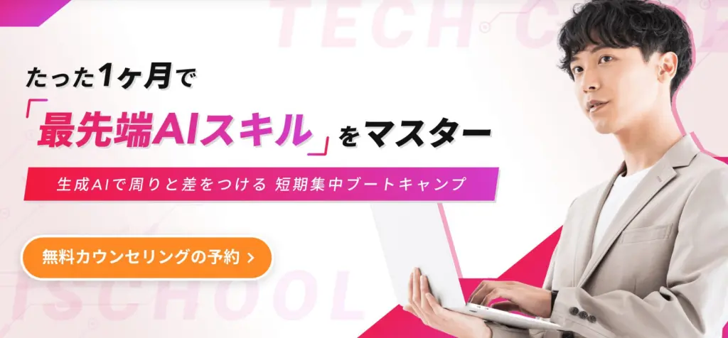 | TECH CAMP | – 未経験からAIスキルを習得し、キャリアアップを目指せるオンラインスクール – プログラミングスクールで有名だったが、生成AIコースも提供 – 30日間でAIの基礎から応用まで集中的に学習 |