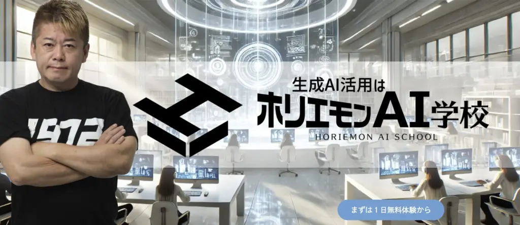 | ホリエモンAI学校 | – 堀江貴文氏(ホリエモン)×株式会社フェローズ運営のAIスクール – 200以上の講義でAIの基礎から実践、ビジネススキルまで幅広く学べる – プログラミング未経験でも安心の講義構成 |