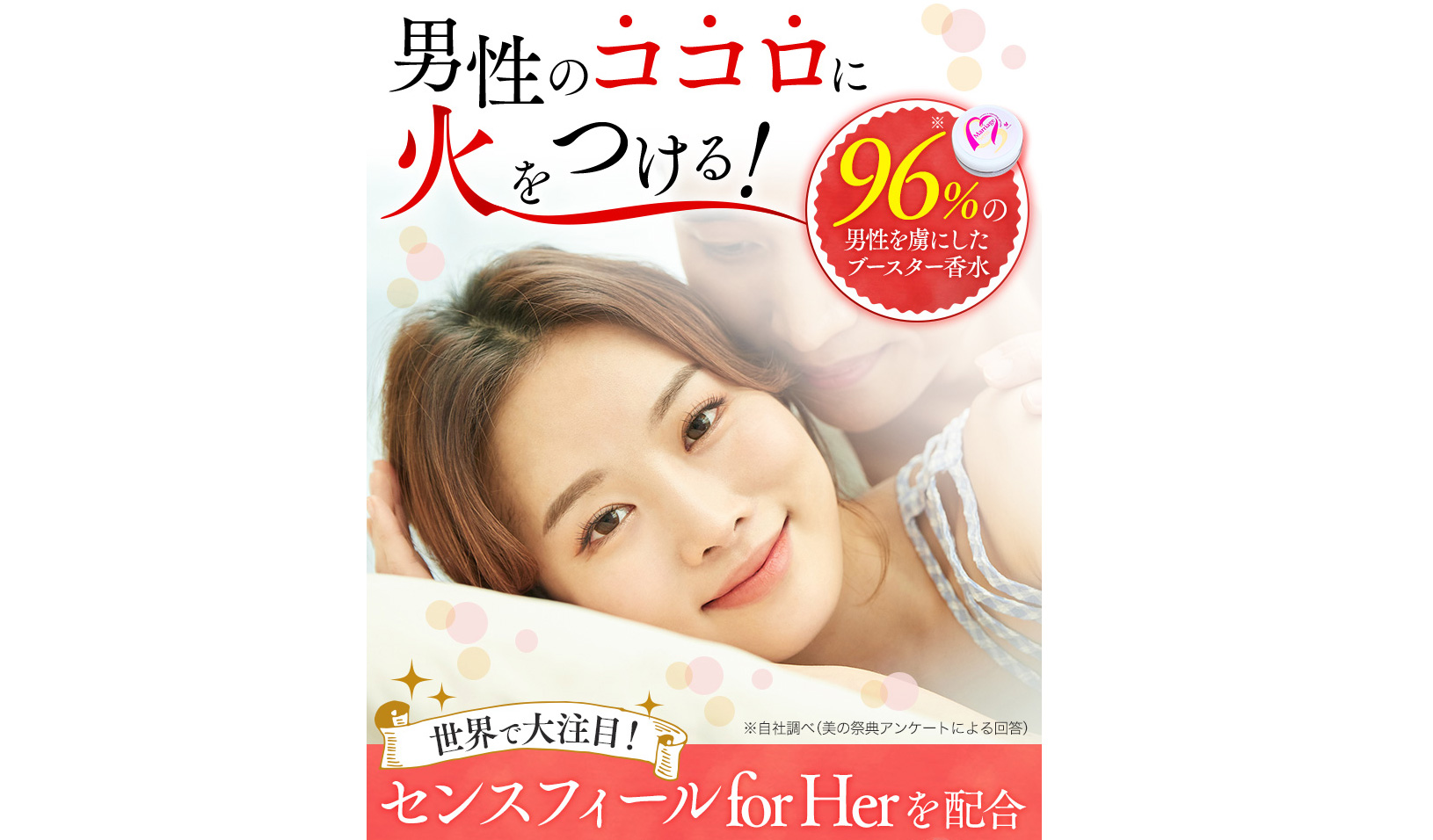 効果の秘密は、センスフィールforHerという、ヒトフェロモン誘惑の効果がある成分にあります。