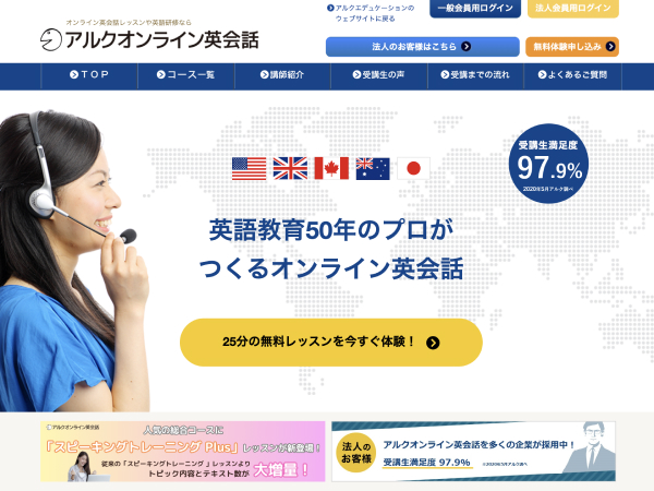 アルクオンライン英会話は受講生満足度97.9%以上、英語教育50年以上のプロが作るオンライン英会話サービスです。アルクオンラインは語学学習教材の制作販売だけに取り組んできたため、他社にはない深い教育メソッドが存在します。オリジナルの教材、学習コースを提供することで効率的な学習が可能です。