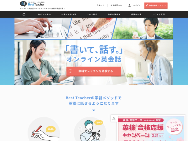 ベストティーチャーは無料体験レッスンを受け付けています。お得なキャンペーンも実施しているため、書いて話して身につけるオンライン英会話スクールに興味がある人は、ぜひベストティーチャーをチェックしてみてください。