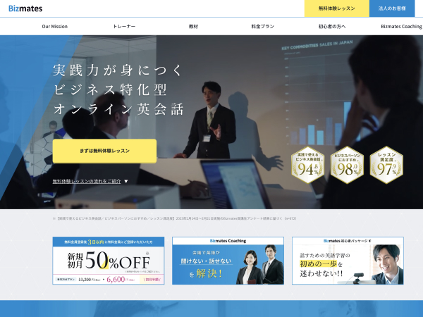 Bizmatesgは無料体験レッスンを提供しています。お得な50%オフキャンペーンも提供しており、追加料金なしの効率的な学習も可能です。気になる人はBizmatesをぜひチェックしてみてください。