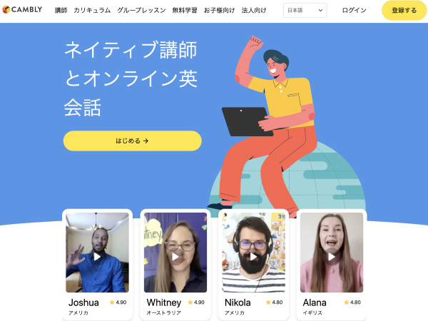 Camblyは業界最大数の10,000人以上の講師が在籍しているオンライン英会話サービスです。所属講師はネイティブスピーカーのみとなっており、レベルの高い英語学習が可能です。
