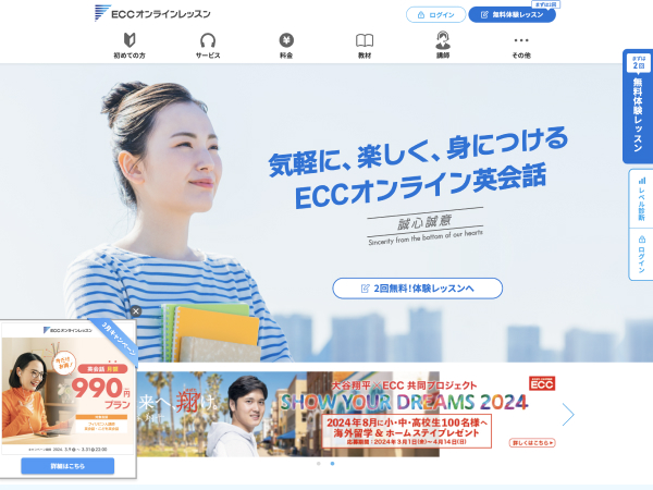 ECCオンラインレッスンは60年以上、本物の教育を追求し「真の国際人」を育てる英会話サービスです。900万人以上のユーザーにサービスを提供しており、単なるスキルとしての語学学習ではなく、相互理解を促進できる人材育成を掲げています。