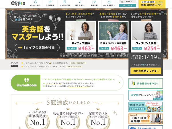 エイゴックスは顧客満足度を含めた3つのアンケートで3冠を取得したオンライン英会話サービスです。24時間365日自宅でレッスンに参加でき、PCやスマホだけでいつでも受講できます。ネイティブ講師のレッスンが1回約463円で受講でき、コストを抑えながら英語学習を進められます。