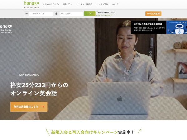 hanasoは92.74%の受講者に満足と評価されているオンライン英会話スクールです。入会金は一切不要で、月額4,000円台・233円からサービスを利用できます。