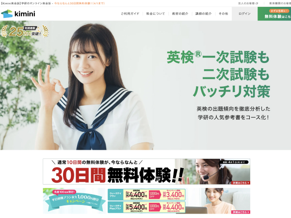 Kimini英会話は利用者数25万人以上、教育業界70年以上の実績を誇る学研が提供しているオンライン英会話サービスです。質の高い教材を提供していることから、200以上の小中学校・大学などの教育機関で導入されています。