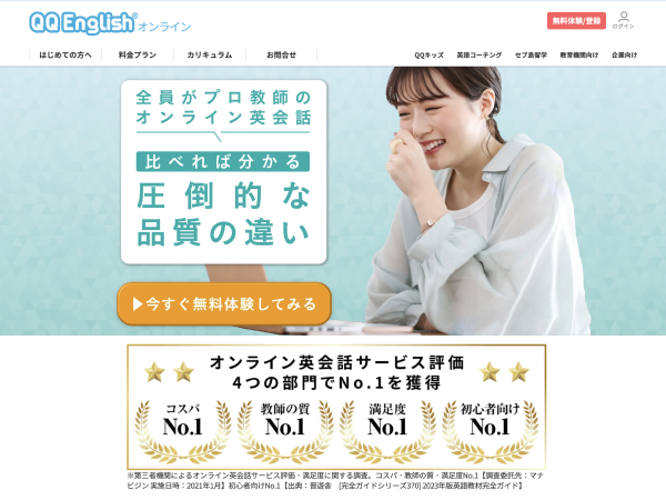 QQ Englishは全員がプロ教師で、オンライン英会話4部門でNo. 1の評価を獲得しているサービスです。QQ Englishの全レッスンが正社員が起用されており、国際資格TESOLを取得している講師のみです。採用後も時間をかけてトレーニングを続けているため、品質にこだわったレッスンを受講できます。