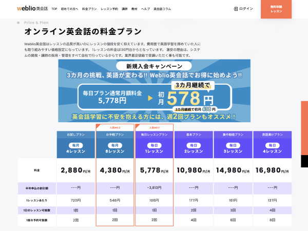 Weblio英会話は教育機関での利用率No. 1を誇るオンライン英会話サービスです。高い品質を担保し続けており、全国の教員から選ばれています。Weblio英会話は2014年のサービス開始から独自のノウハウを蓄積しており、品質を維持したままで1レッスン137円〜で利用できます。
