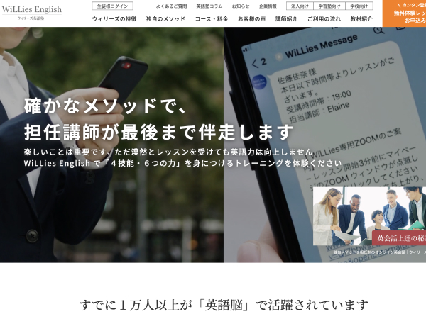 ウィリーズ英語塾は担任講師制でレッスン完了まで一緒にサポートしてくれるオンライン英会話サービスです。独自のメソッドを持った担任講師が学習指導から相談まで乗ってくれるため、初めて英語学習を始める人でも安心です。