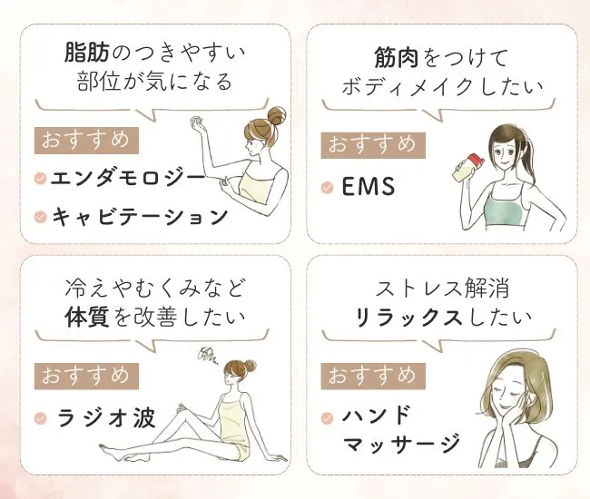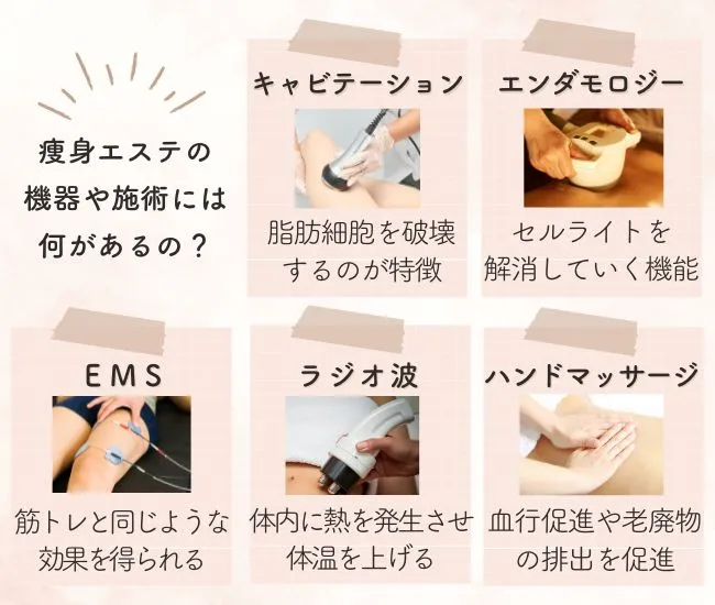 瘦身エステの機械や施術ってどんなものがあるの? その効果は? そんな疑問を解消して、自分の目的や悩みに合う内容をセレクトして。