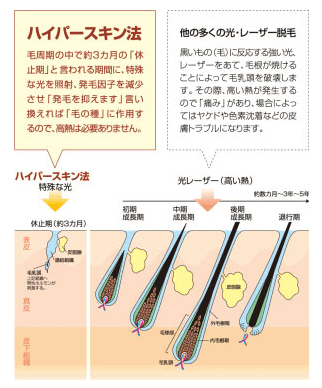 バルジ領域という発毛器官に作用するため、日焼け肌にも照射可能であり、痛みも少ない。