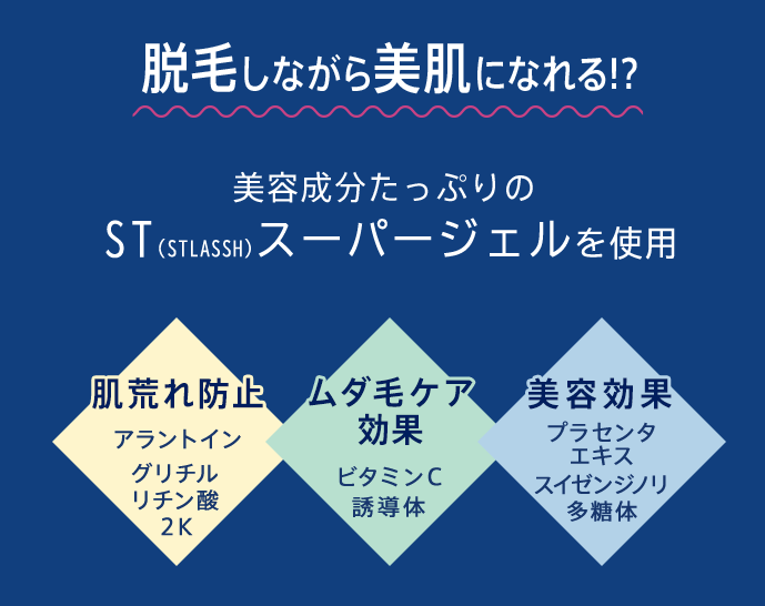 ISGトリプルアタック脱毛とは、産毛もしっかり脱毛可能なSHR脱毛に、黒ずみケアや太い毛に最適なIPL脱毛、そして豊富な美容成分であるSTスーパージェルを組み合わせたもの。