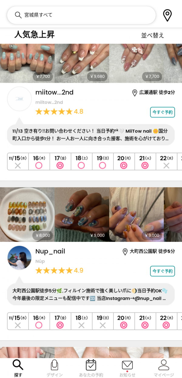 お気に入りのネイルデザインを見つけたら、そのネイリストに直接予約。また、ほかの予約サイトでは見つけられない最新のネイルデザインやSNSで人気のネイリストの情報も提供されています。自分だけの特別なネイルデザインを見つけて、予約が可能です。