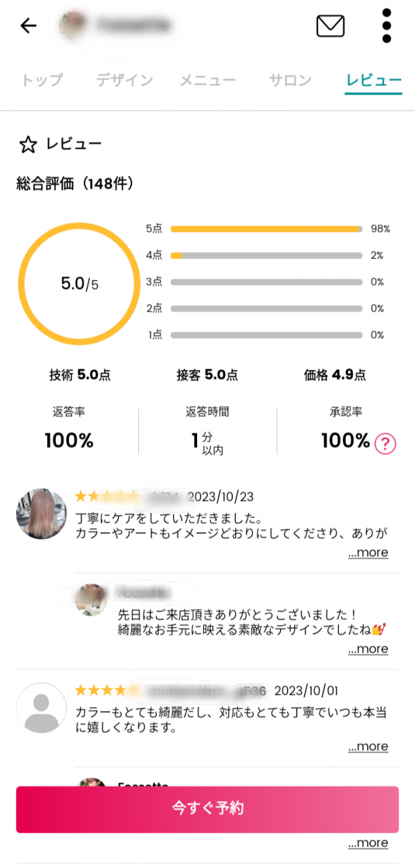 ネイリストのレビューやコメントを見ることができます。ネイル技術・接客・価格の3つの面からネイリストを評価。ほかのユーザーのレビューや評価を見ることで、自分が予約しようとしているネイリストの実力を知ることができ、安心して予約ができます。