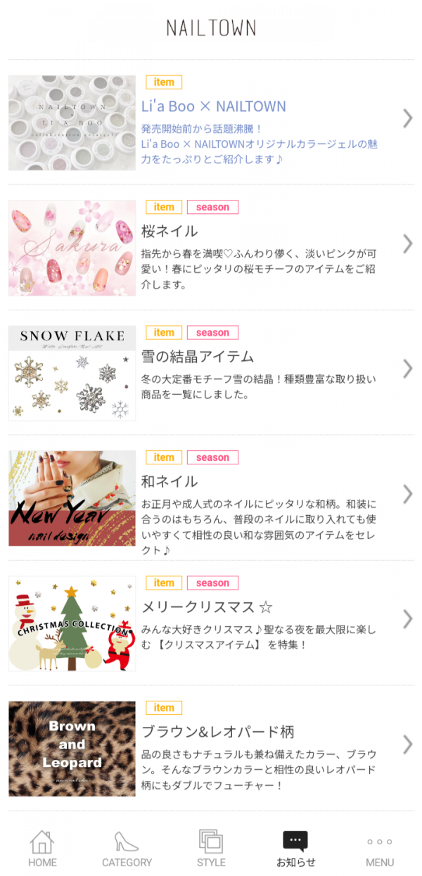基本的なネイルアートのやり方や季節のトレンドを教えてくれる記事が充実。ちゅるんとした質感の出し方やミラーパウダーの使い方など、知りたい情報盛りだくさんです。お正月には和ネイル、春には桜ネイルなど季節に合わせた記事も。さらにネイルが楽しくなります。